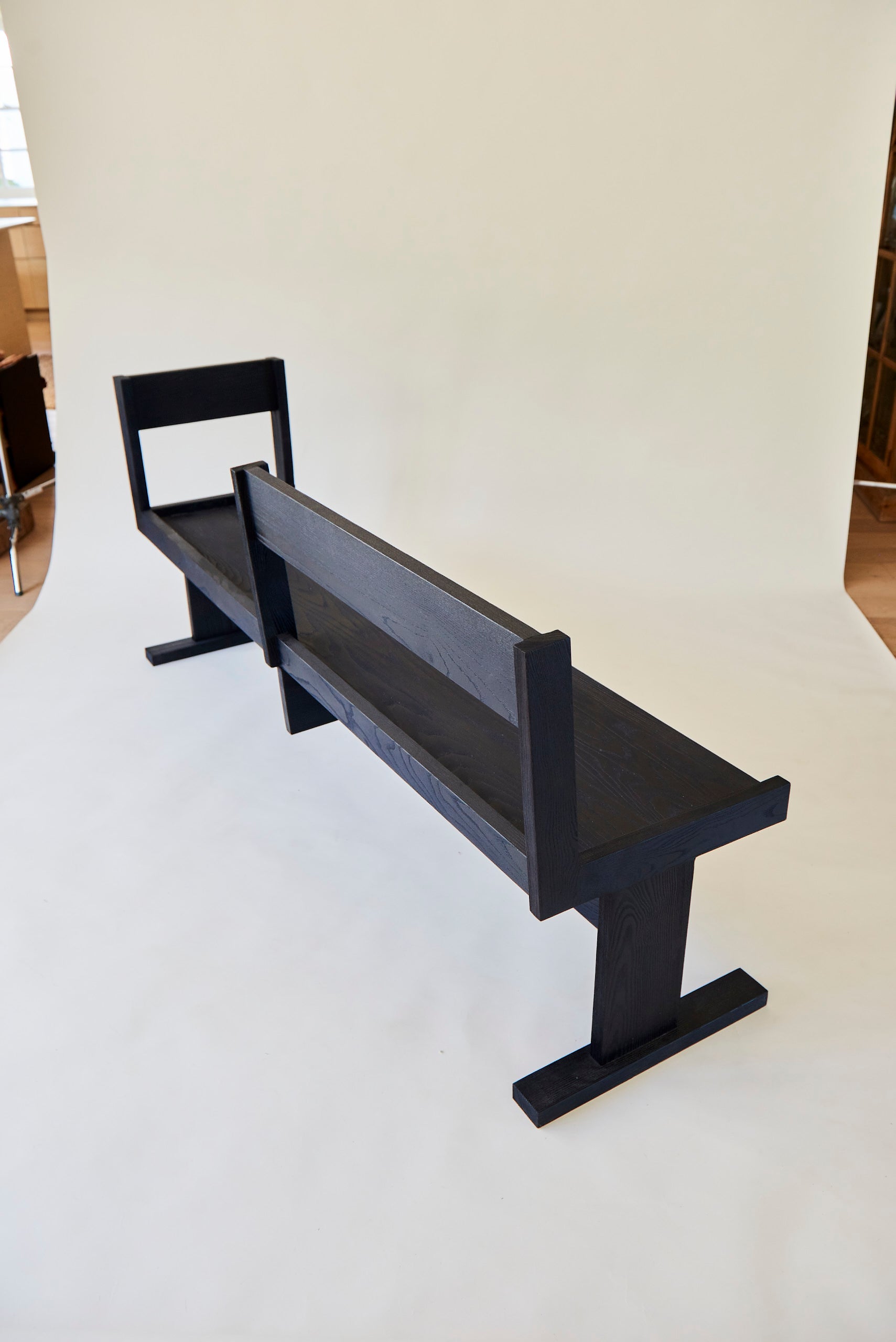 Details of photographed product | Ash timber with a sand blasted surface texture and a carbon stain. Featured with and without the optional addition of a seat cushion.